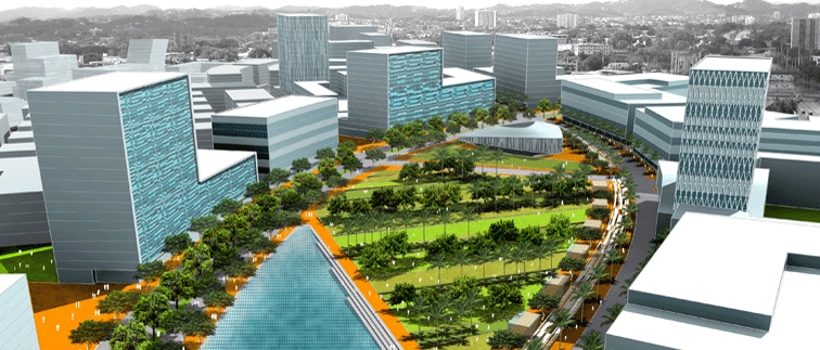 Figure 6: the landscape of postmodern urbanism? The Knowledge Corridor, San Juan, a mixed-use urban core with housing, retail, school, hotel, and public space integrated with research laboratories (Source: Topos v71, 2010, and www.fieldoperations.net)